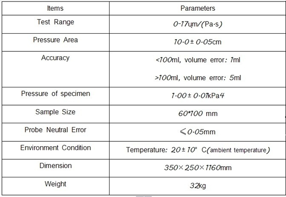 Applying in testing air permeability of different kinds of paper (not contain the rough surface paper), such as cement bag paper, sack kraft paper, cable paper, copy paper, filter paper and so on.